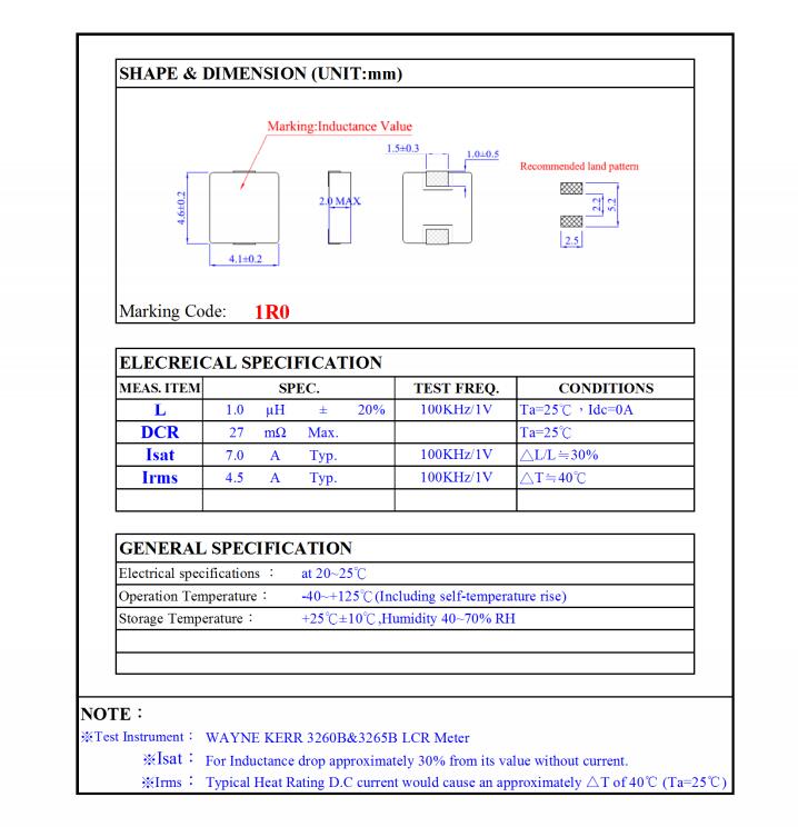 型号:AMPI0420ED1R0MT电感值:1.0uH额定电流:4.5A